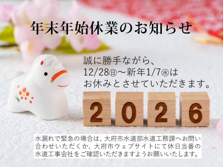 【年末年始休業】 2025年12月28日(日)~2026年1月7日(水) 期間中は何かとご迷惑をおかけしますが、何卒ご了承の程宜しくお願い申し上げます。 1月8日(木)より通常営業いたします。 ●水漏れで緊急の場合は大府 […]