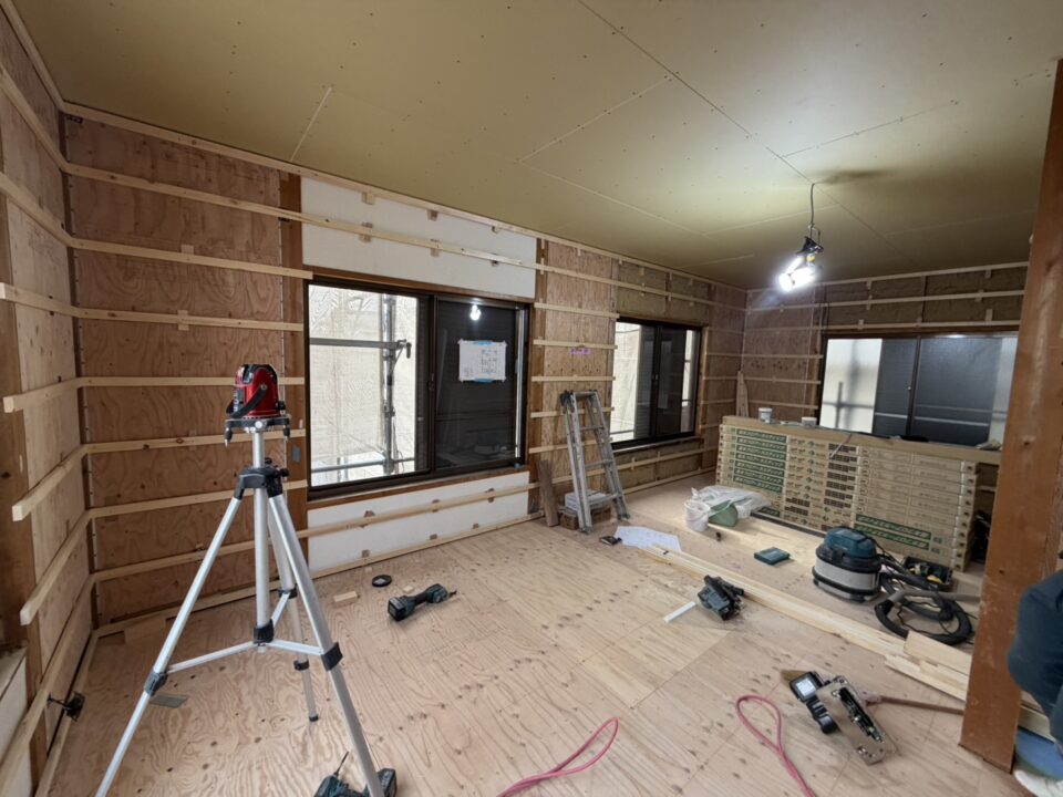 2階の洋室を改修しているところですが、耐力壁(構造用合板)や金物補強させて頂き、全体的に傾き調整を行っております。