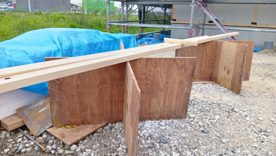私が見に行ったときは応援大工が頑張ってくださってました。外には板を十字に組んで作った台が置いてありました。