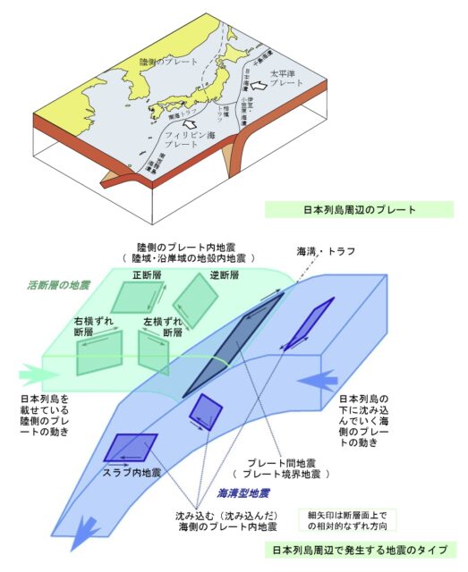 沈み込んだプレートが、日本列島が乗っている北米プレート(北海道~東北~関東)、ユーラシアプレート(中部~関西~中国・四国~九州)を押し上げる力が働き、弱い断層部を刺激するという仕組みです。