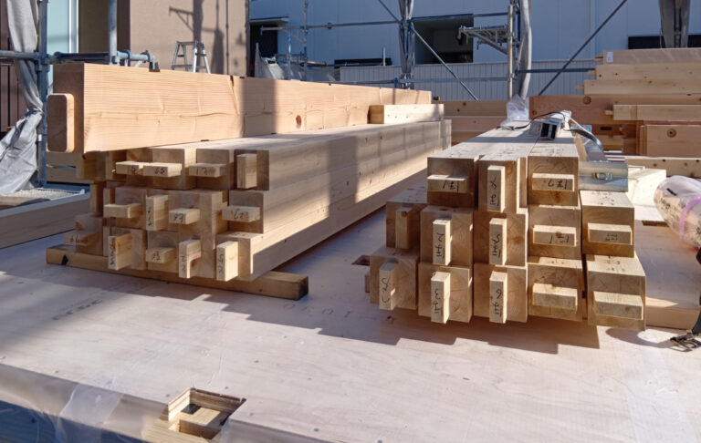 建方を待つ材木たち