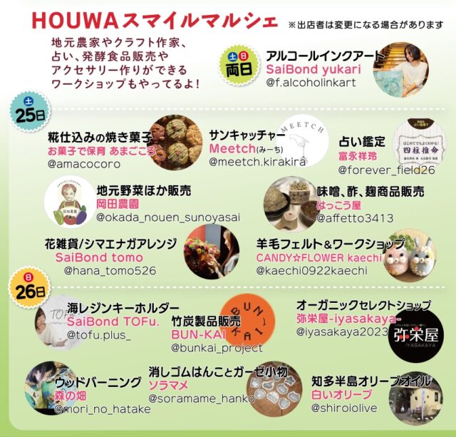 HOUWAスマイルマルシェ 4/25・26両日(順不同)