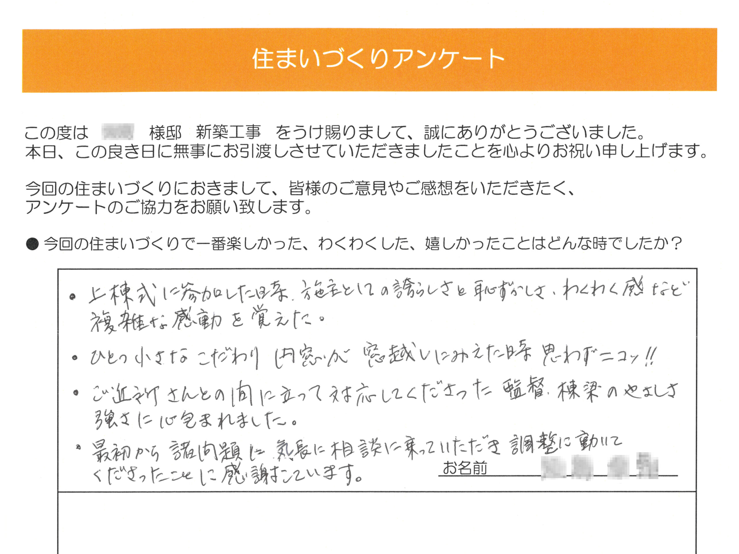 ・上棟式に参加した時、施主としての誇らしさと恥ずかしさ、わくわく感など複雑な感動を覚えた。