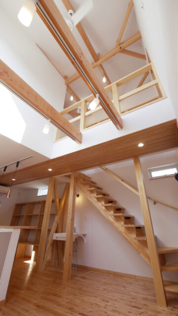 リビングから吹き抜けを見上げると見える立派な梁、サイコーです!